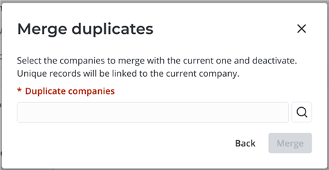 Merge company records in case of their legal merge or accidental creation of duplicate records (for instance, during the import). To do so, open the master company form (it must be active) and in the burger menu click Merge duplicates to open the modal window of the same name:
