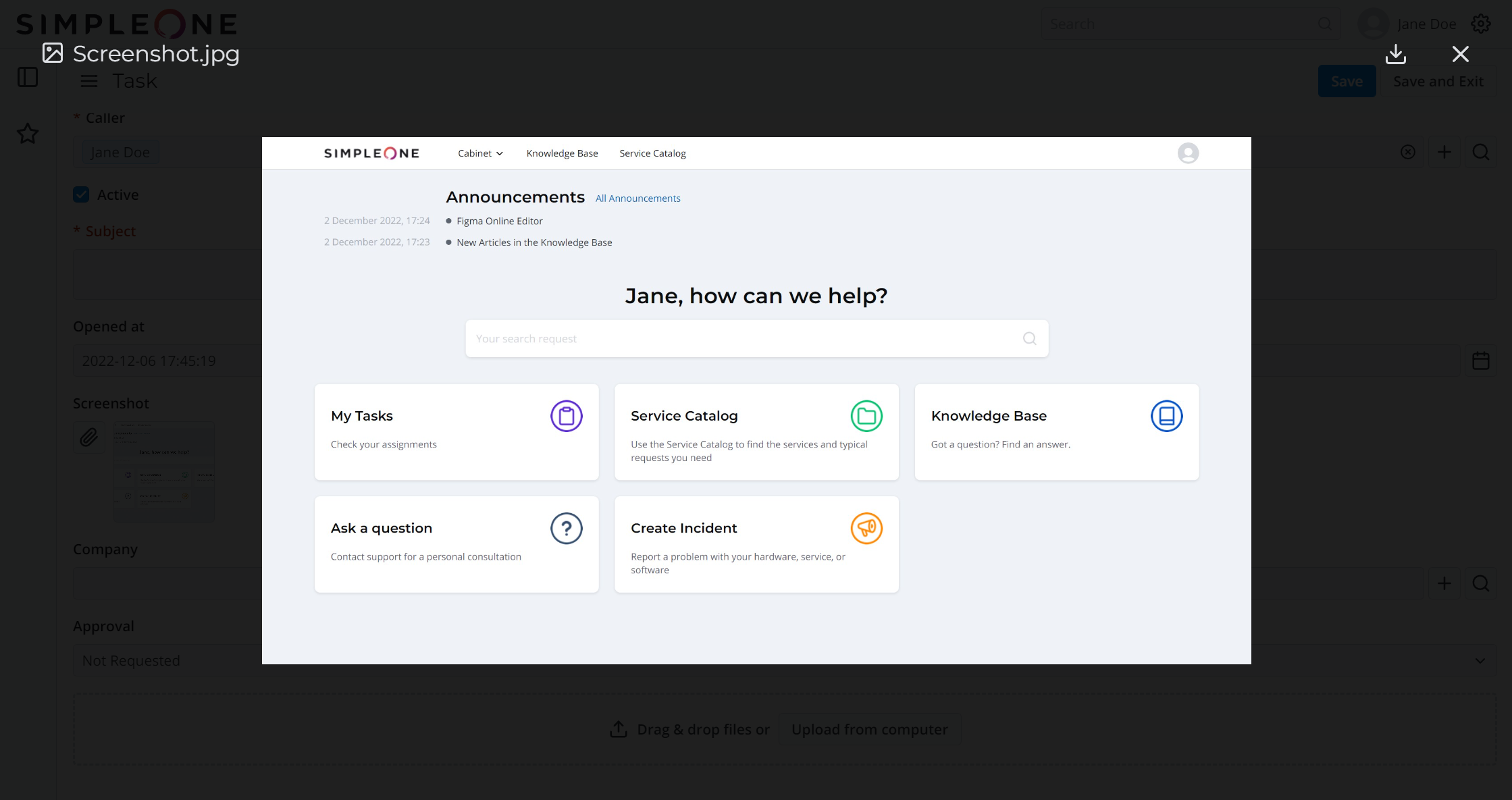 SimpleOne supports attaching files to existing or newly created records. You can attach files to a record directly, use the attachment window or an image field. This article describes how to use these interface elements to add and manage attachments.