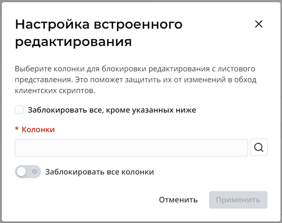Кнопка Применить активна только если включена опция Заблокировать все колонки или заполнено поле Колонки.
