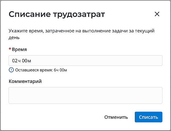 В появившемся модальном окне укажите затраченное на задачу время и добавьте комментарий к ней, при необходимости.