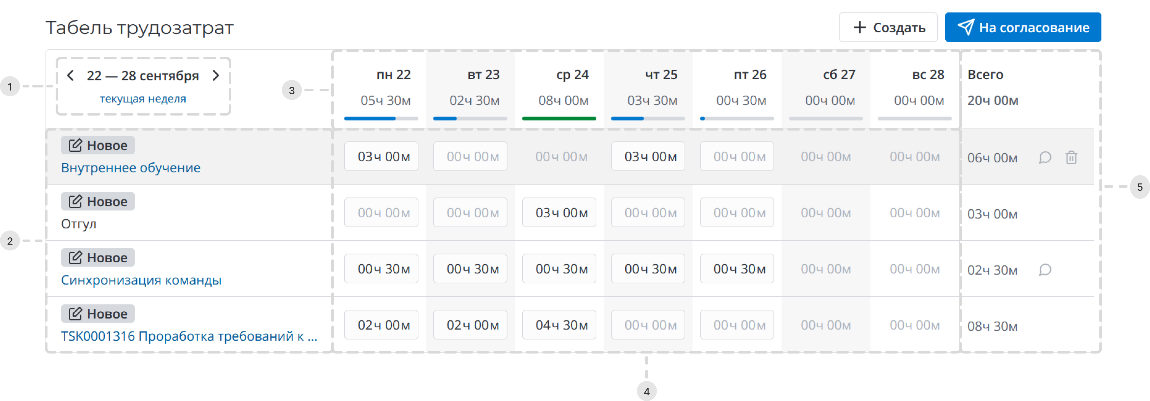 Карточки трудозатрат и статусы их согласования.
