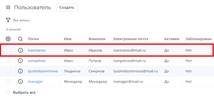 Например, запись в таблице Пользователи (user) выглядит следующим образом: