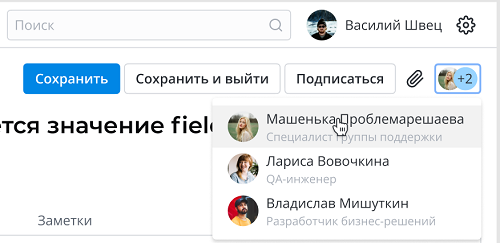 Нажмите на индикатор присутствия, чтобы открыть выпадающий список пользователей, взаимодействующих с записью.