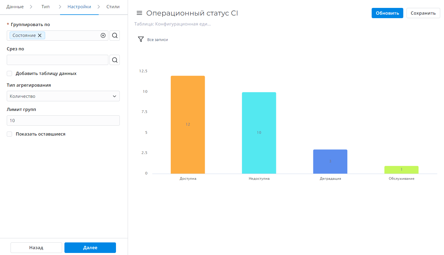 | Минимальное значение | Нет | Укажите минимальное значение для данных, заданных в Агрегировать по колонке. |