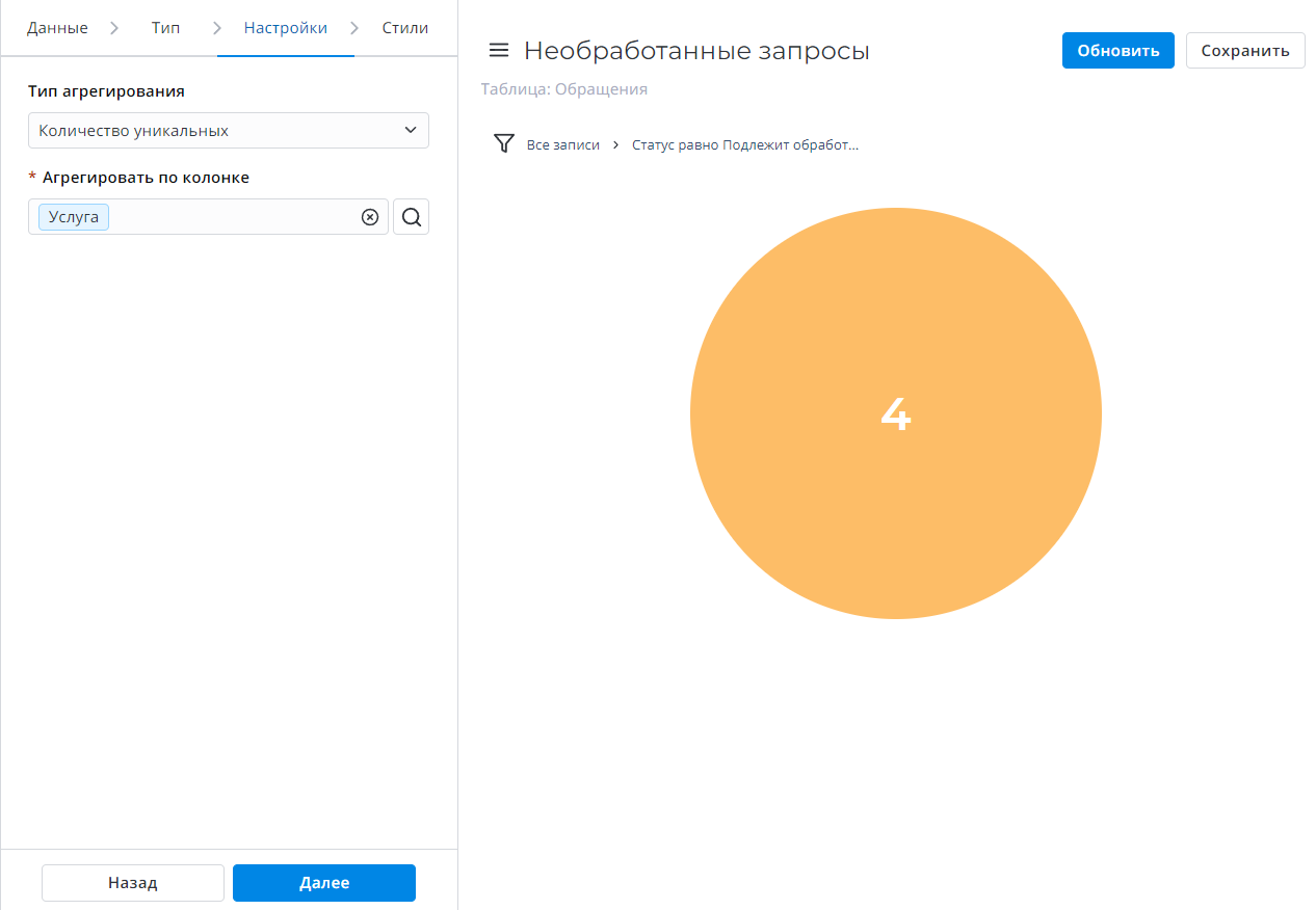 | Агрегировать по колонке | Да | Выберите колонку таблицы с числовыми значениями для агрегации данных. Поле Агрегировать по колонке доступно, когда в поле Тип агрегирования выбрана одна из следующих опций: Среднее, Количество уникальных или Сумма всех. |