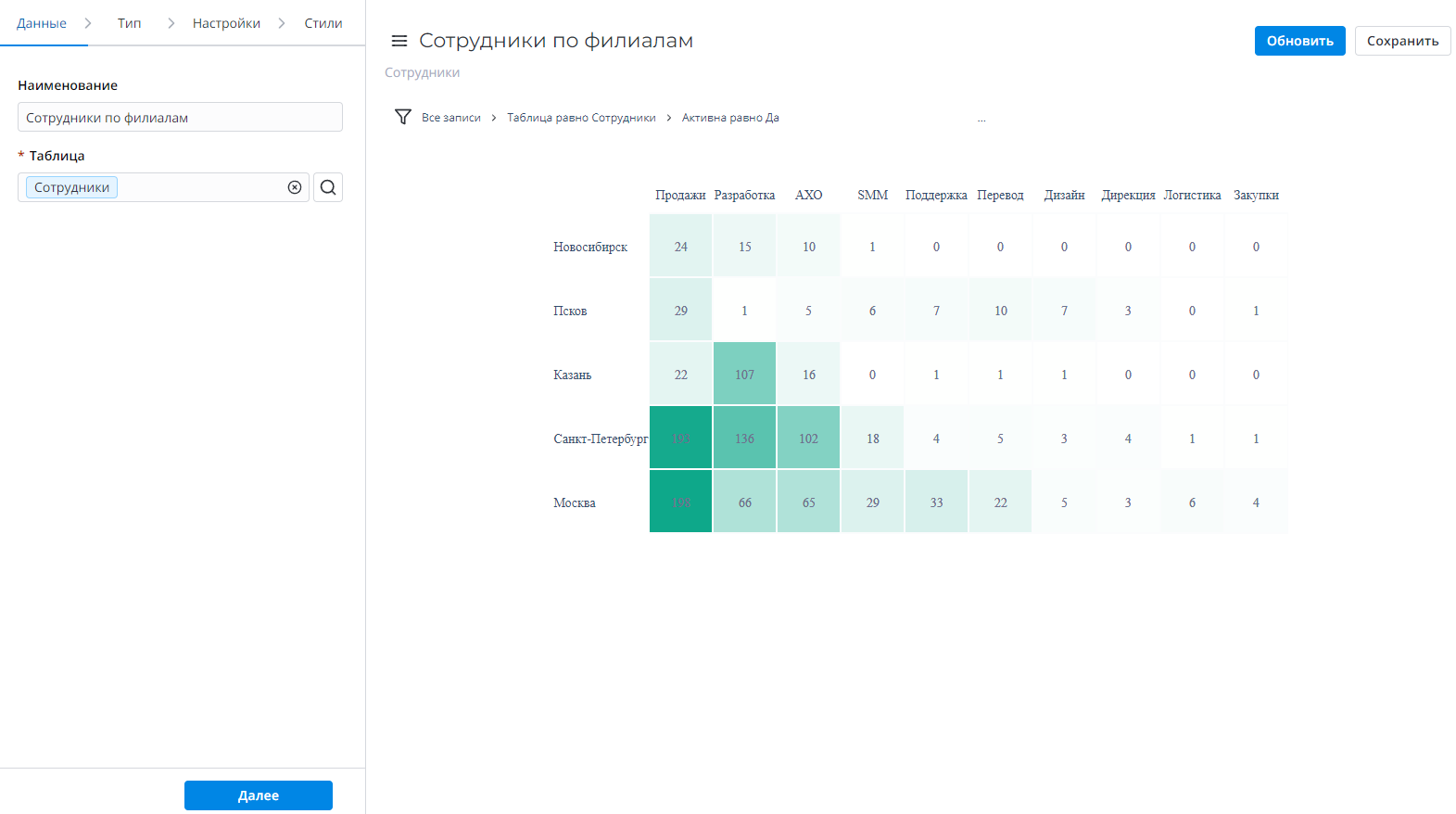 | Строка | Да | Выберите колонку таблицы, которая будет использоваться как строка для тепловой карты отчета. |
