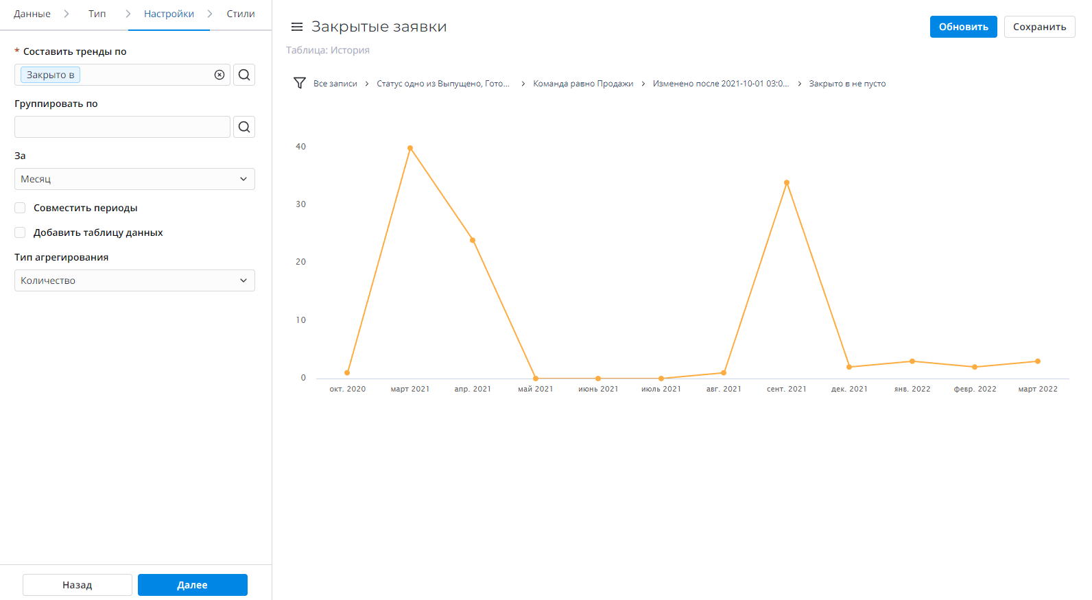| Составить тренды по | Да | Выберите колонку таблицы типа Date/Time, чтобы использовать ее для определения периода времени. |