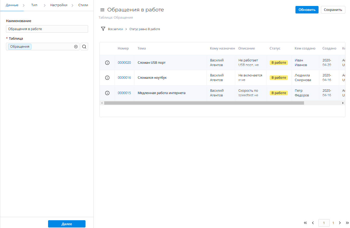 | Список | Да | Выберите представление списка таблицы для отчета. |