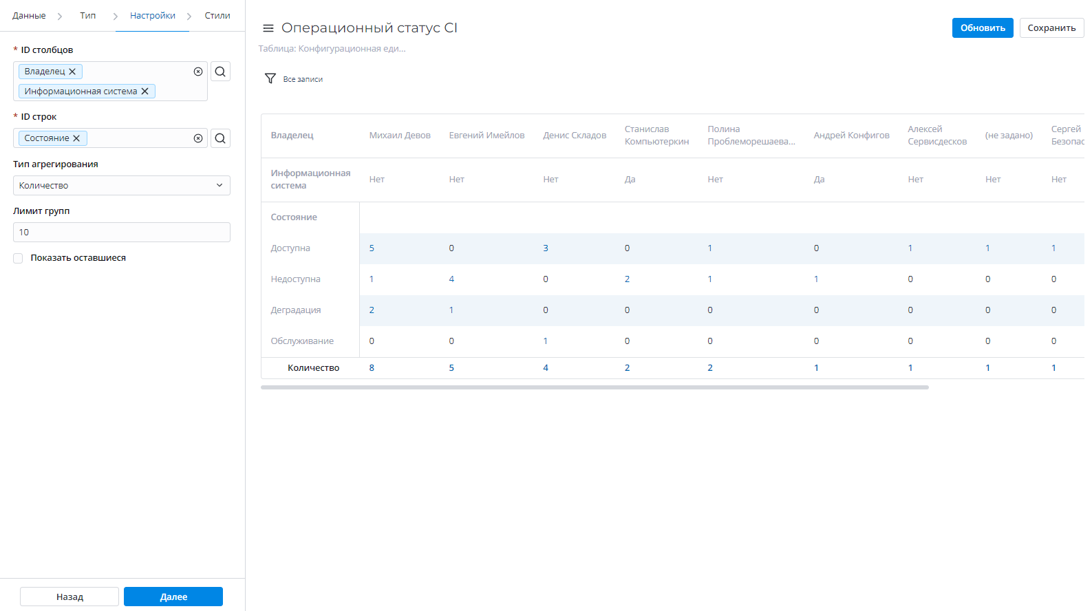 | Строка | Да | Выберите колонку таблицы, которая будет использоваться как строка для сводной таблицы отчета. |