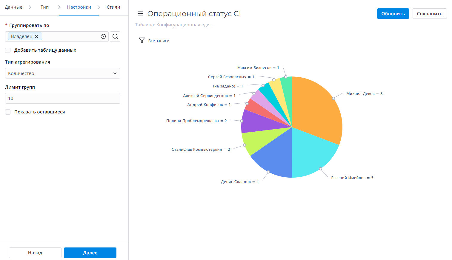 | Группировать по | Да | Выберите колонки таблицы как критерии для группировки данных. |