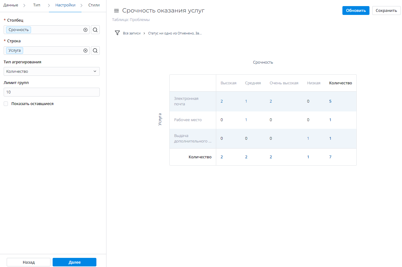 | Столбцы | Да | Выберите колонки таблицы, которые будут использоваться как столбцы для многоуровневой таблицы отчета. |