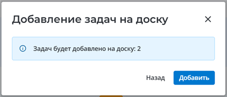 4. В открывшемся модальном окне Добавление задач на доску вы увидите число выбранных задач. Если при добавлении задач на доску будет превышен WIP-лимит первого столбца доски, вы увидите соответствующее предупреждение. Нажмите Назад, чтобы вернуться на предыдущий шаг и изменить список задач. Нажмите Добавить, чтобы добавить выбранные задачи на доску проекта.