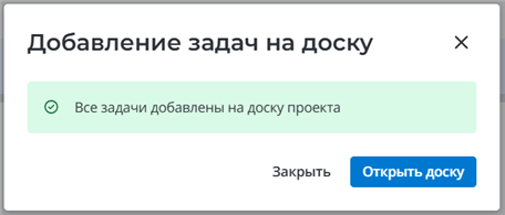 6. Нажмите Закрыть, чтобы закрыть модальное окно и остаться в виджете Пополнение доски, или Открыть доску, чтобы перейти на доску проекта.