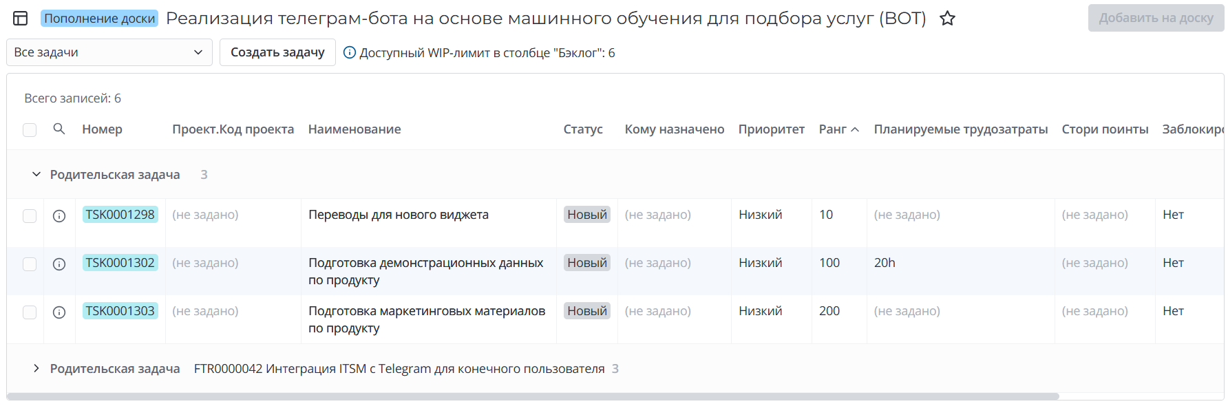 При добавлении задач на доску проекта вы можете ориентироваться на Доступный WIP-лимит в столбце "Название столбца" – число задач, которые можно перевести в статус первого активного столбца до превышения WIP-лимита. Это число зависит от WIP-лимита первого столбца доски или WIP-лимита области, в которую он входит.