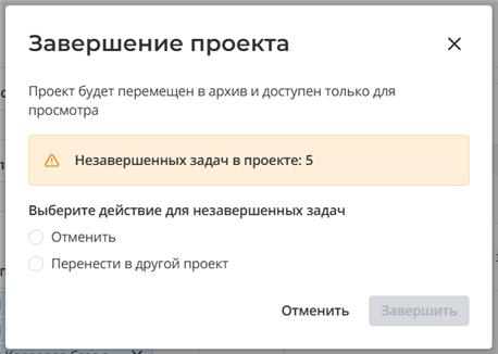 Если с проектом связаны не выпущенные и не отмененные задачи первого, второго и третьего уровней, статус которых не является конечным по порядку среди опций колонки Статус таблицы этого типа задач (по умолчанию Готово), выберите действие для этих задач: