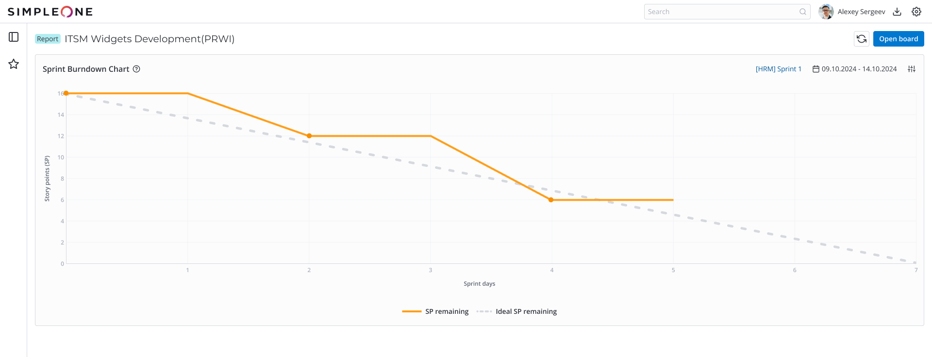 - Story points (SP) – the overall number of story points in the sprint tasks. The report includes only third-level tasks of the current sprint in all states except for New. Canceled tasks are not included. If the number of story points is not specified for a task, it is not included either. The actual sprint burndown line descends on this axis as the tasks are burnt.