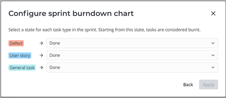 In this window, specify the state that indicates a task is burnt. You can do this for each third-level task type in the project that is also in the current sprint. You can select from the states included in the state models of those task types in the current project. If the state model in the project record is not created for a task type, all states are available. Click Apply to save the configuration and refresh the report.