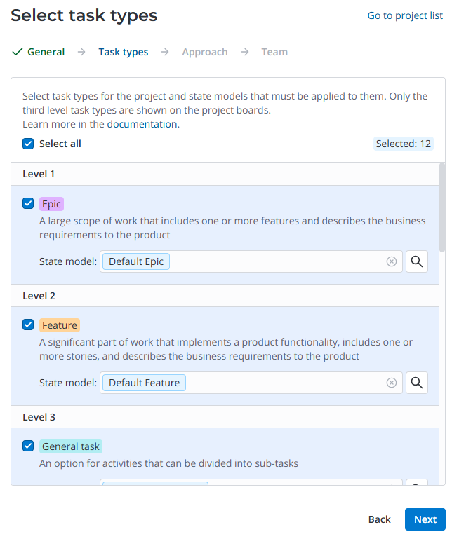 Select the first, second, and third level task types to be used in the project. Click Select all to select or clear the checkboxes next to all available task types. Note that: